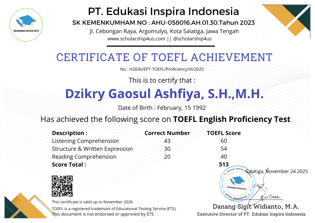 Sertifikat TOEFL-Dzikry Gaosul Ashfiya, S.H.,M.H.